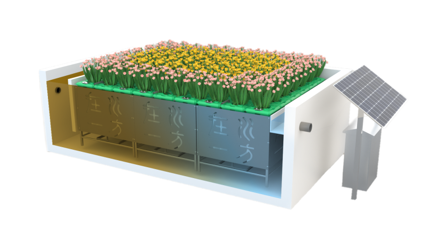 T-Bic生物净化池的运维简单,仅需常规巡视,无需专业人员运维;可全流程采用新能源动力供能,也可切换市电;电耗极低,吨水电耗低至0.06-0.07元,总体运行成本低至0.1元/吨水。